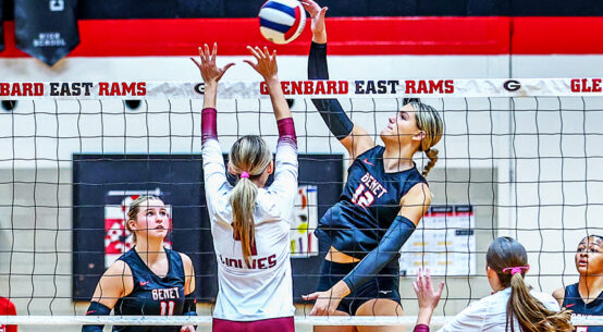 Benet Academy middle hitter Lynney Tarnow (12) and the Redwings took over the No. 1 spot in Class 4A of this week's Michio Chicago VBA/Illprepvb.com Girl;s H.S. Rankings. (Photo by...