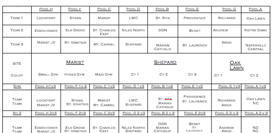 Pool A Joliet West def. Von Steuben 21-25, 25-15, 19-17Bolingbrook def. Joliet West 23-25, 25-23, 18-16Riverside-Brookfield def. Von Steuben 25-21, 25-23Riverside-Brookfield def. Bolingbrook 25-21, 25-21Pool B Lincoln-Way West def. Joliet Central 25-15, 25-21Wheaton North def. Lincoln-Way West 25-22, 21-25, 15-9Joliet Central def. Proviso West 25-14, 25-13Wheaton North def. Proviso West 25-13. 25-13 Pool C St. Charles North def. Plainfield South 25-15, 25-18Stevenson def. Plainfield South 25-2, 25-12St. Charles North def. Oak Forest 25-2...