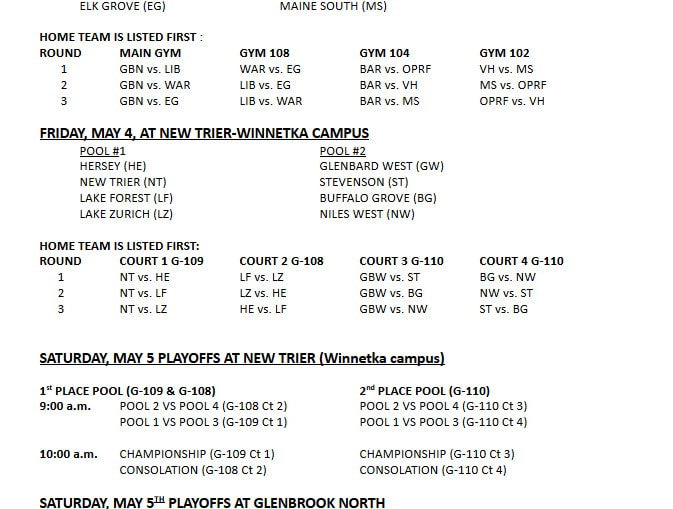 Glenbrook South def. Niles West 25-22, 25-21Glenbrook South (10-10, 3-3 in the Central Suburban South): Thomas Cavallaro (32 assists), Jack Shampine (5 kills, 4 blocks, 5 aces), Konrad Wojslaw (9 kills, 4 blocks), Joe Masloski (11 kills, 2 aces), Colin Roy (7 kills, 4 blocks). Libertyville def. Mundelein 25-16, 25-14Mundelein (14-12, 2-3 in the North Suburban Conference): Ben Arebalo (1 ace, 1 assist, 9 digs), Steven Miritello (8 assists, 1 kill), Marc Rey (3 kills, 1 block), Abram Nazario (4 kills, 1 assist, 2 digs), Tyler Vander Pl