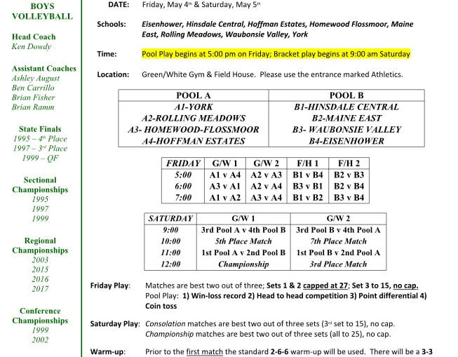 Addison Trail def. Downers Grove South 25-18, 25-19Addison Trail (19-7, 5-0 in the West Suburban Gold): Jacob Grygo (13 assists, 10 kills, 3 blocks), David Zielinski (6 kills, 5 assists), Justin Werderitch (4 kills), Joe Mosny (1 kill, 2 blocks), Bryan Florian (6 digs, 3 assists, 1 kill), Christopher Garcia (2 aces, 2 digs). Barrington def. Fremd 25-22, 25-15Fremd (11-9, 3-5 in the Mid-Suburban West): Aaron Peterson (6 kills, 2 digs), Rocco Stella (5 blocks), Jacob Peterson (2 kills, 5 digs, 7 assists, 3 blocks), Martin Michalski (2 kills,