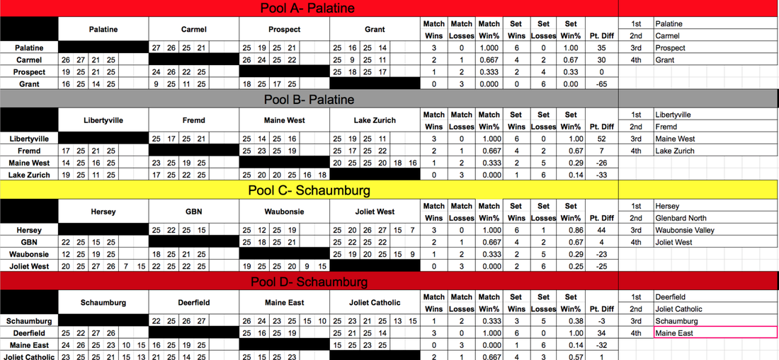 Addison Trail def. Morton 25-10, 25-14Addison Trail (16-3, 4-0 in the West Suburban Gold): Jacob Grygo (23 assists, 6 kills, 2 aces, 2 blocks), David Zielinski (12 kills, 4 digs, 2 blocks, 2 aces), Justin Werderitch (4 kills, 3 blocks), Joe Mosny (3 kills, 2 blocks), Mikey Strycharz (3 kills), Bryan Florian (13 digs), Christopher Garcia (6 digs). Barrington def. Schaumburg 25-16, 25-22Barrington (18-5, 6-0 in the Mid-Suburban West): Gabe Hartke (8 kills, 2 aces), Michael O'Toole (7 kills, 6 digs), Petar Lumovic (6 kills, 2 blocks), Evan C...
