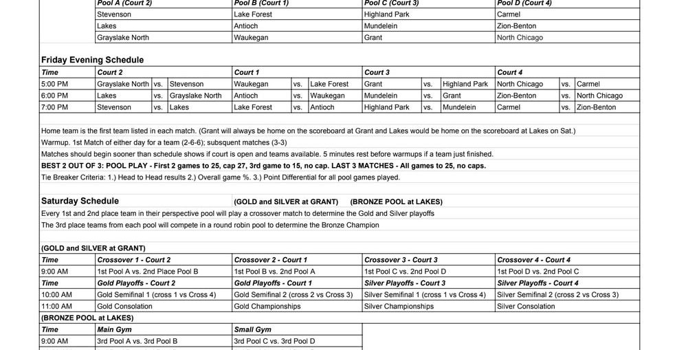 Stevenson defeated Lake Forest to win the Lake County Tournament Carmel def. Zion-Benton 25-19, 20-25, 15-9Carmel def. North Chicago 25-20, 25-7Carmel def. Highland Park 26-24, 14-25, 25-20Stevenson def. Carmel 25-16, 25-21Carmel def. Zion-Benton 20-25, 25-22, 25-17 (third place)Carmel (10-4): Jackson Ptasienski (55 kills, 32 digs, 3 aces), Jimmy Harvey (18 kills, 6 block, 5 aces), Austin James (6 kills, 74 assists, 33 digs), Jordan DeGuzman (43 assists, 29 digs), Bob Xie (12 kills), Mike Scott (11 kills, 5 blocks), Shayne Henderson (57
