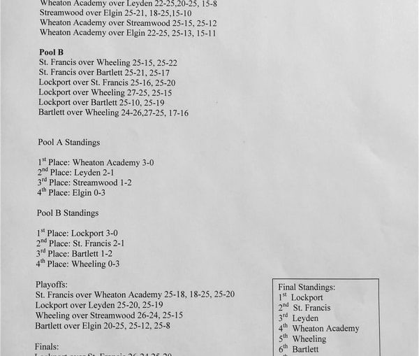Lockport won the Streamwood Sabre Invitational on Saturday. Lockport def. Wheeling 27-25, 25-15Lockport def. St. Francis 25-16, 25-20Lockport def. Bartlett 25-10, 25-19Lockport def. Leyden 25-19, 25-20 (semifinals)Lockport def. St. Francis 26-24, 25-20 (championship)Lockport (15-6): Kyle Dixon (10 kills, 2 blocks), Anthony Pfeiffer (8 kills, 9 assists), Jacob Prince (15 assists, 6 digs) in championship match.St Francis def. Bartlett 25-21, 25-17St Francis def. Wheeling 25-15, 25-22Lockport def. St. Francis 25-16, 25-20St. Francis ...