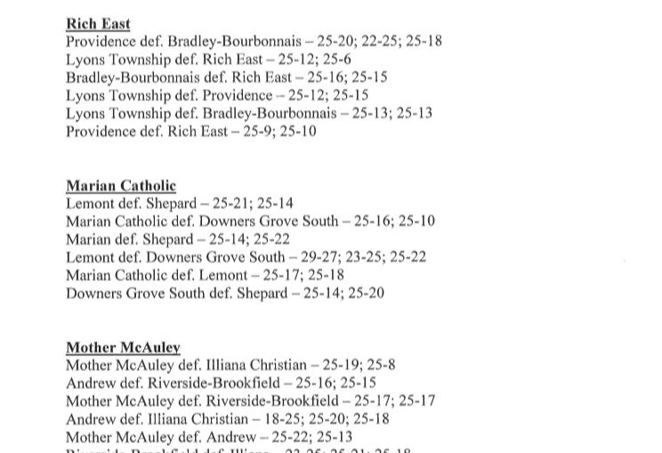 No. 22 Durand def. Orangeville 25-8, 25-9Durand (18-1 overall, 5-0 in the Upstate Illini): Marissa Kelsey (28 assists), McKenzie Damon (15 kills, 5 digs), Katie Nevdal (6 kills), Hannah Proctor (7 kills). Orangeville (6-7-1 overall, 2-4 in the Upstate Illini).Lane Tech def. Maine West 25-17, 21-25, 25-19Maine West (9-9): Yesenia Santiago (5 kills), Ellie Centella (5 kills), Krysta Block (12 digs), Reilly Olson (8 kills, 11 digs).Payson-Seymour def. Jacksonville Routt 25-21, 25-23Payson-Seymour (11-5): Riley Epperson (12 kills), Cassie E...