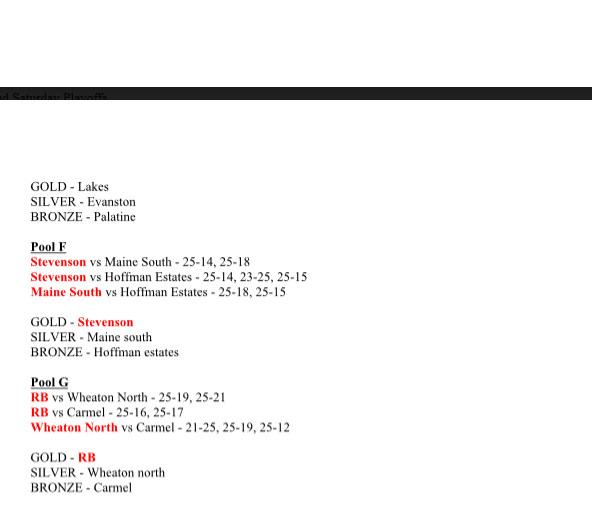 Tuesday, April 9 Results Bartlett def. No. 24 West Aurora 23-25, 25-17, 25-21 Carmel def. Warren 25-22, 25-22Carmel (5-5 overall, 1-0 in the East Suburban Catholic): Andersen Ptasienski (10 kills, 1 ace, 2 blocks), Camden Strutzel (3 kills), Camden Colter (3 kills, 1 block), David Foecking (2 kills), Sean Seidl (20 assists, 6 digs), Matt Herron (16 digs, 2 aces). No. 7 Deerfield def. Maine West 25-15, 25-18 Downers Grove North def. No. 12 Sandburg 25-23, 25-23Sandburg: Cort Jensen (6 kills), Luka Vukanic (6 kills).Downers Grove North (6...