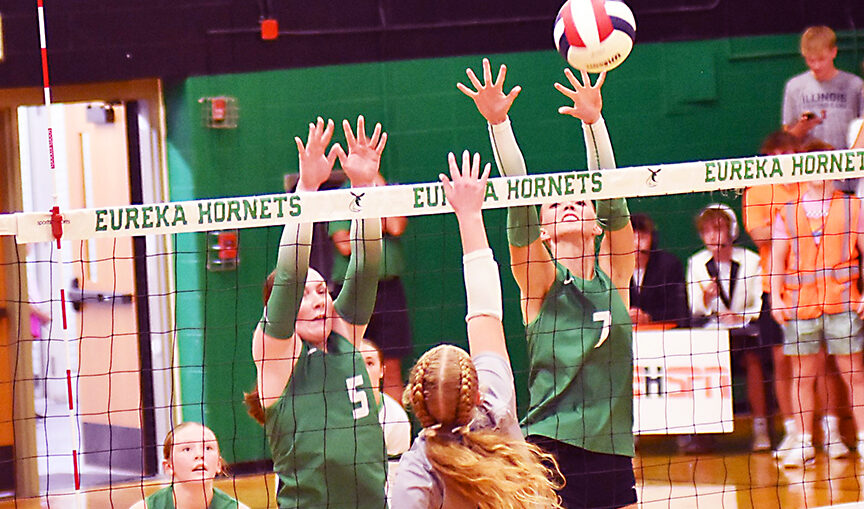 Eureka High School turned back visiting Minonk Fieldcrest, 25-20, 25-13, with help from Ellie Payne (13), Leah Sears (5), and Isabelle Axelson (7) on Tuesday. (Photo by Randy Sharer) By Randy Sharer Special to Illprepvb.comEUREKA – The Eureka volleyball team graduated five seniors from last year’s 27-8 squad, but the program's winning tradition remained.That much was clear during a 25-20, 25-13 win over visiting (Minonk) Fieldcrest on Tuesday that lifted the Class 2A Hornets to 14-3 overall and 4-0 in the Heart of Illinois Conference.“I ...