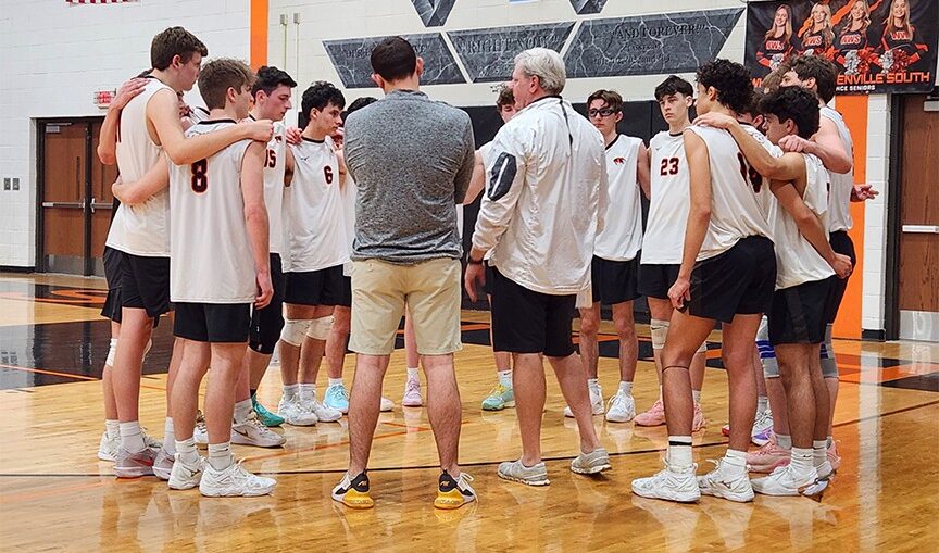 Wheaton Warrenville South coach Bill Schreier huddles with his team between sets of the Tigers' 25-14, 25-22 victory over Highland Park in Tiger Classic pool play Thursday. Thursday, April 16 results Argo def. Lemont 25-22, 25-23Lemont (10-9 overall, 2-2 in the South Suburban Conference): Aiden McIntyre (7 kills), Mike Tilly (6 digs), Jacob Emini (7 assists).Barrington def. Hersey 23-25, 25-19, 25-22Barrington (8-2 overall, 3-0 in the Mid-Suburban West): Matt Kravstov (21 kills, 1 ace, 3 blocks, 6 digs), Denis Kukovski (11 kills, 5 digs...