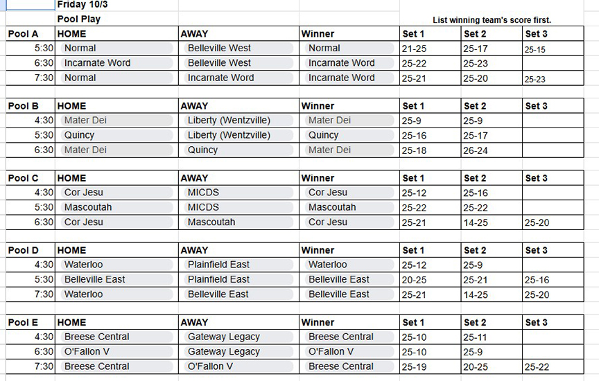 Huntley (12-4 overall, 10-2 in the Fox Valley Conference): Sophia Tocmo (10 digs, 1 ace), Rachel Hein (3 kills, 3 assists), Emily Ernst (2 kills, 3 assists, 2 blocks), Mia Jacobelli (6 kills, 3 digs, 2 aces), Catherine Callahan (1 dig), Summer Massow (2 kills), Maya Mangan (2 kills), Abby Whitehouse (8 assists, 2 digs), Izzy Whitehouse (3 kills, 6 digs, 1 ace).