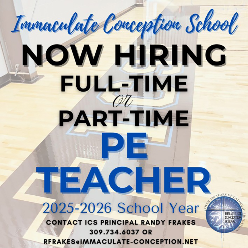 Immaculate Conception School in Monmouth, Illinois, is seeking a full- or part-time physical education teacher.