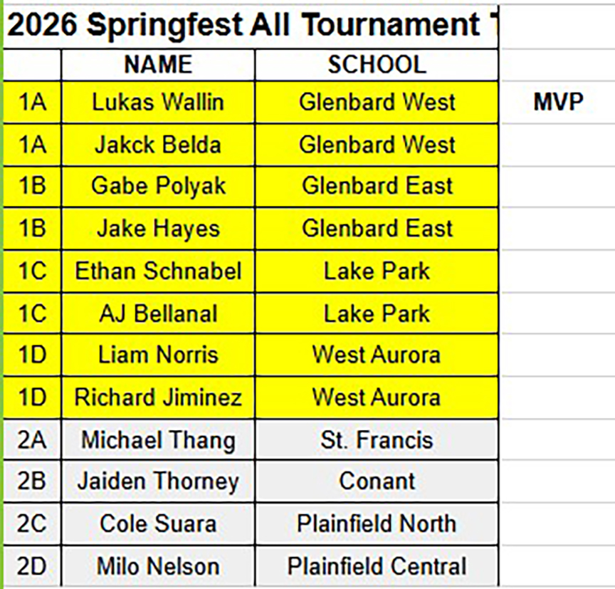 St. Francis (8-3 overall, 0-0 in the Chicago Catholic League): Michael Thang (113 assists, 17 kills, 11 blocks, 2 aces 25 digs), George Gnorski (35 kills, 4 blocks, 8 digs, 1 assist), Garrity Bennett (20 kills, 8 blocks, 5 aces, 5 digs), Liam Smith (30 kills, 2 blocks, 2 digs, 1 assist), Evan King (16 kills, 14 blocks), Mateo Casimiro (27 digs, 6 assists, 2 aces), Luke Davis (13 kills, 4 blocks), Augustine Cin (6 kills, 2 aces, 17 digs, 3 assists), Abe Kap Cin Khai (16 assists, 21 digs), Jackson Blaha (4 aces, 6 assists, 17 digs), Jack Shannon (1 kill, 1 block).