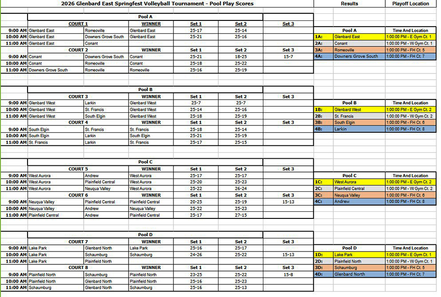 Glenbard East (12-1 overall, 1-0 in the Upstate Eight Conference): Jake Hayes (8 aces, 41 digs, 5 assists), Gabe Polyak (42 kills, 19 digs, 6 blocks, 2 assists), Loyce Mojica (4 aces, 54 assist, 14 digs), Charlie Cooper (1 ace, 57 assists, 9 digs), Angel Sanchez (4 kills, 3 blocks, 1 assist, 4 digs), Jackson Yates (14 kills, 6 blocks, 3 digs), Max Waldshmidt (22 kills, 7 blocks, 2 digs), Nate Lynch (25 kills, 12 blocks, 10 digs), Michael Hoffmann (9 kills, 19 blocks, 1 assist, 6 digs), Cole Smith (6 aces, 8 kills, 18 digs).