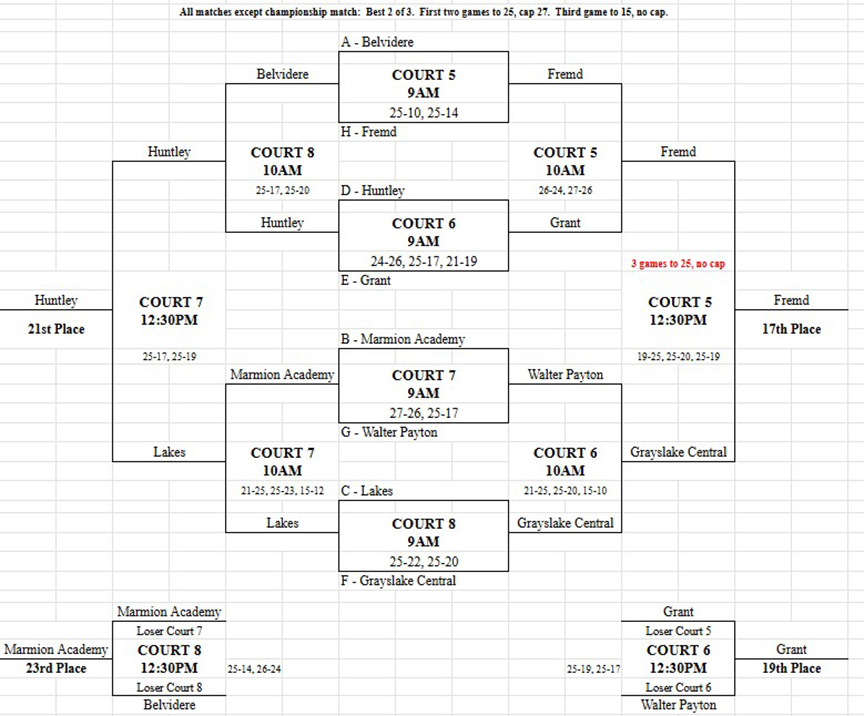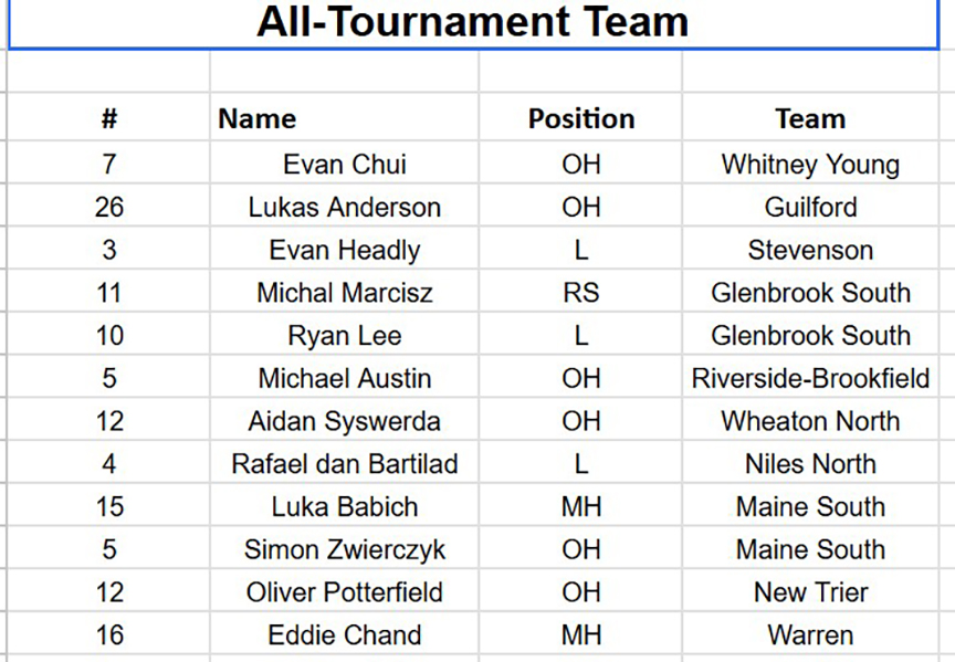 Palatine (3-5 overall, 0-2 in the Mid-Suburban East): (Saturday statistics) John Joyce (32 assists), Will Santiago (12 kills), Daniel Rusu (13 kills, 4 aces), Brandon Murga Bartels (12 kills, 5 blocks), Logan Brown (8 blocks, 4 aces).