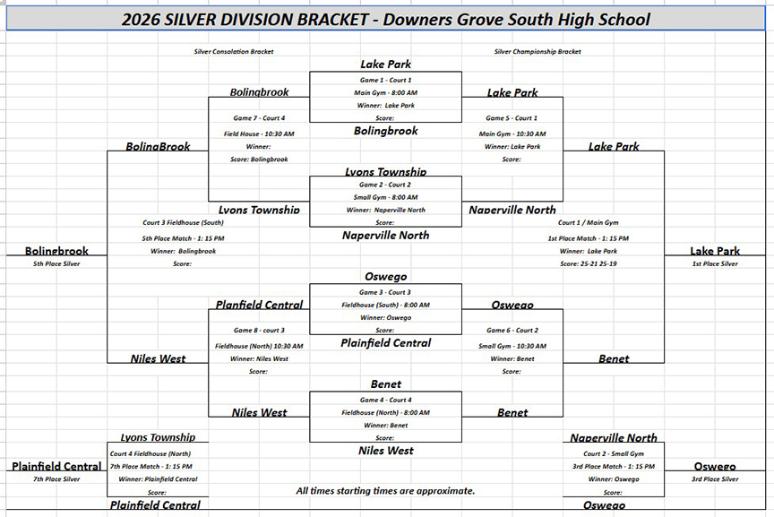 Wheaton Warrenville South (23-2 overall, 3-0 in the DuKane Conference): Ryan Sweeney (12 assists), Matthew Burkly (4 assists), Simon Bratt (14 kills, 3 aces, 2 assists), Liam Noonan (1 kill), Logan Thornton (4 kills), Marko Polovina (2 kills, 1 ace), Aiden Wink (1 kill), Nathan Paige (5 digs).