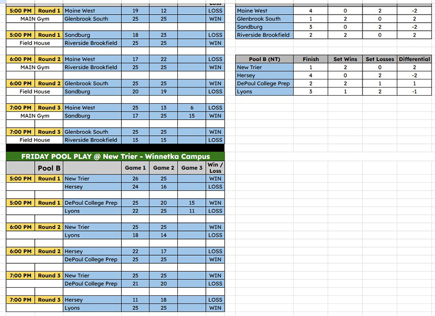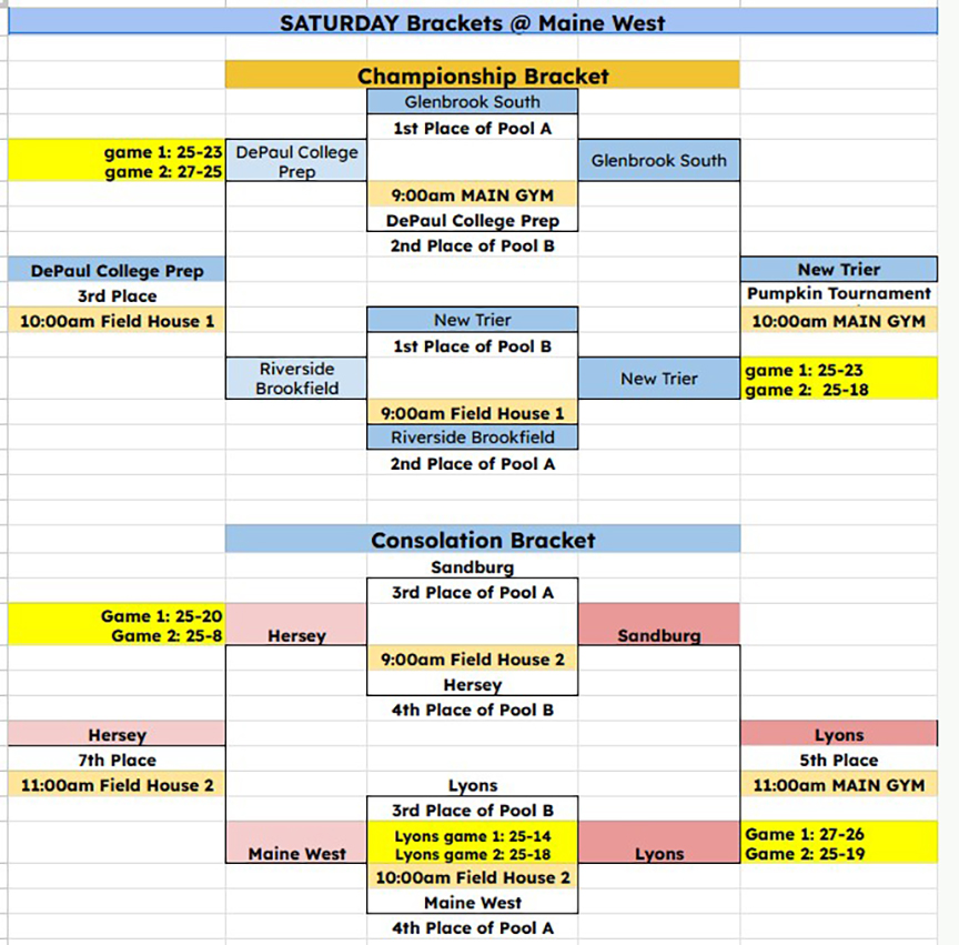 Vernon Hills (20-13 overall, 6-2 in the Central Suburban North): Aria Shah (34 assists, 3 aces), Grace DeYoung (18 assists, 4 aces), Alyssa Kopanytsa (17 assists, 4 aces), Ellianna Russell (12 kills), Kiersten Cieslinski (29 kills, 3 aces, 3 blocks), Mya Beitzel (11 kills, 4 blocks), Emma Isakhanian (7 kills, 4 blocks), Annabelle Smith (14 kills), Claire Ayvazian (15 digs, 2 aces), Allyson Koetz (15 digs, 3 aces).